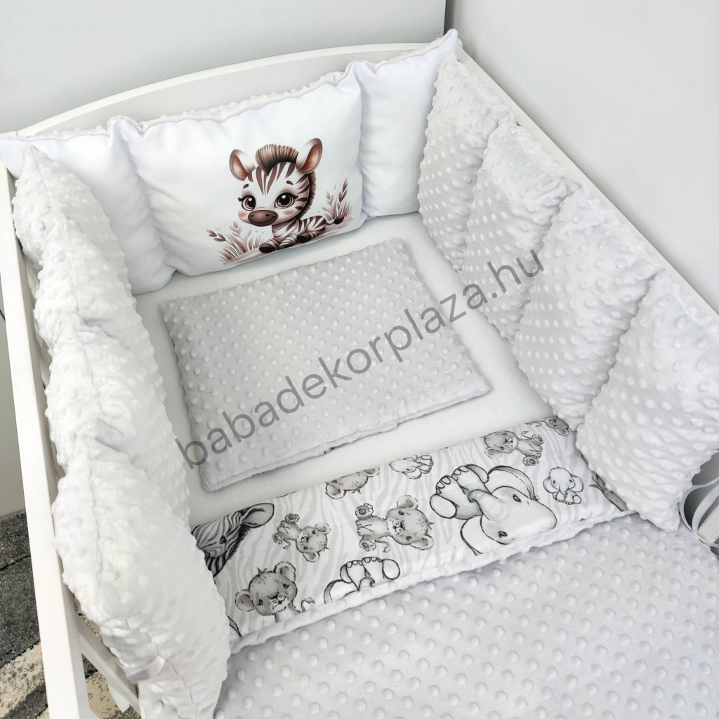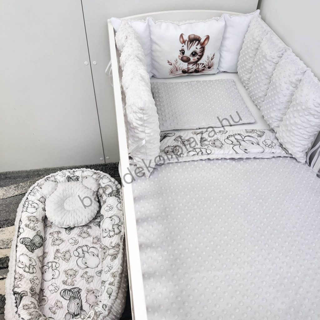 Deluxe Baby babaágynemű garnitúra babafészekkel, Extra párnás rácsvédővel - Dreamland Collection - szürke - bébi szafari zebra
