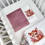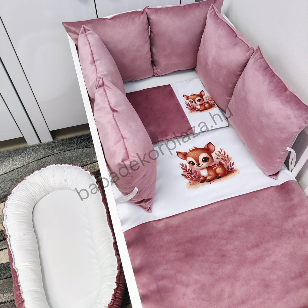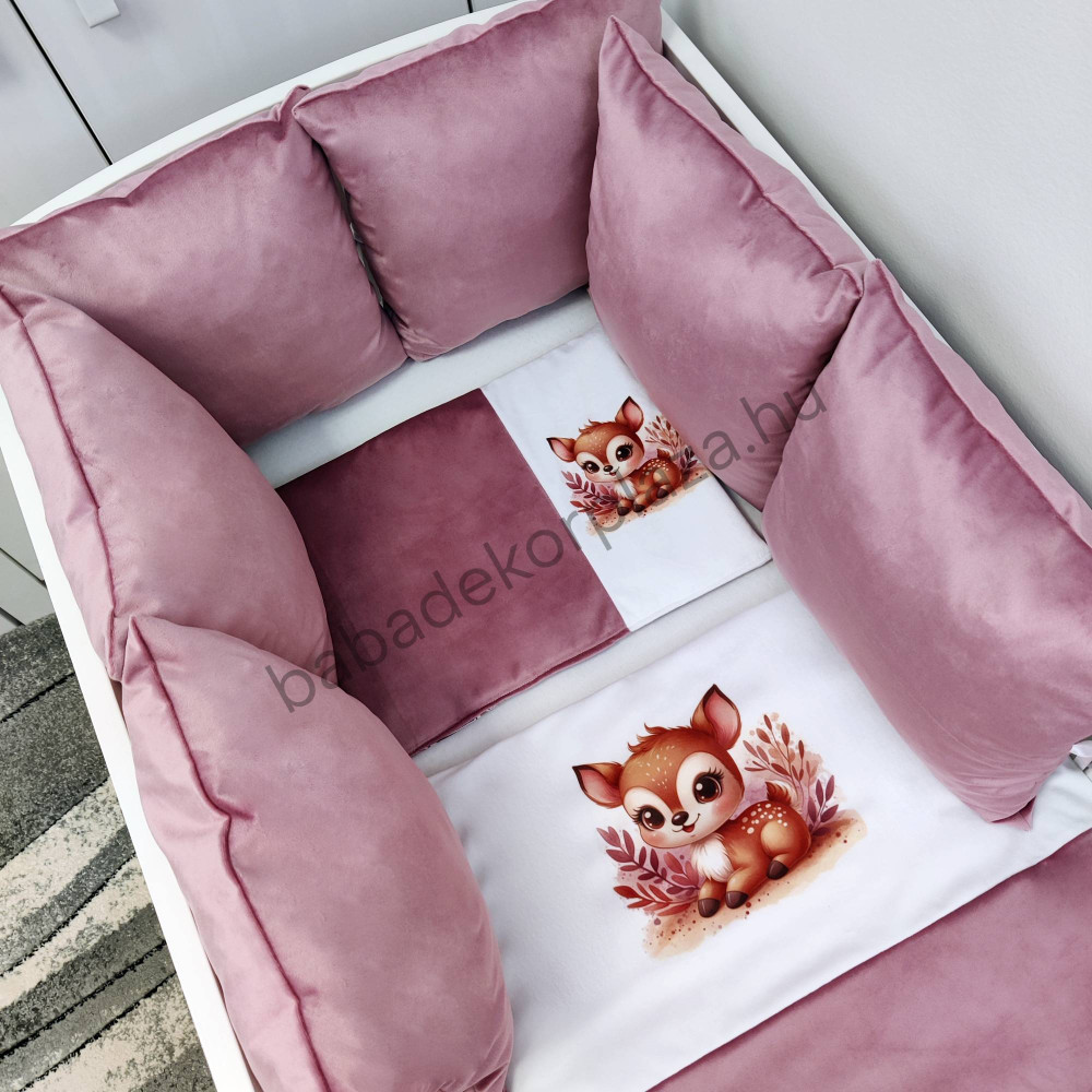 Deluxe Baby babaágynemű garnitúra babafészekkel, párnás rácsvédővel - mályva bársony - vidám bébi őzike