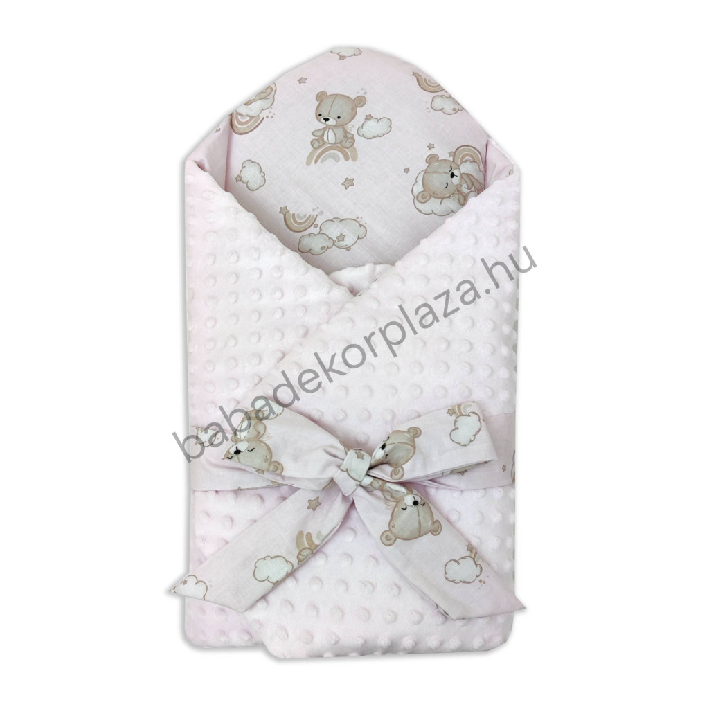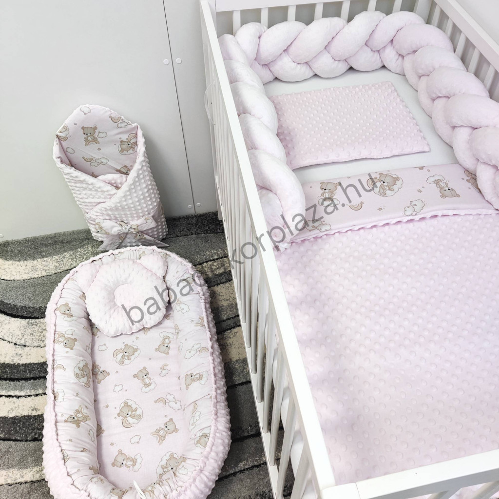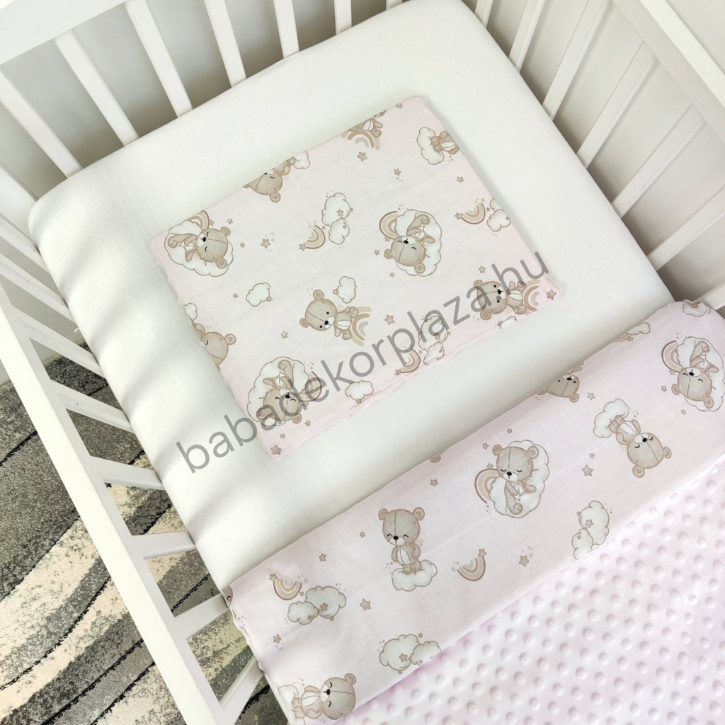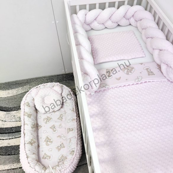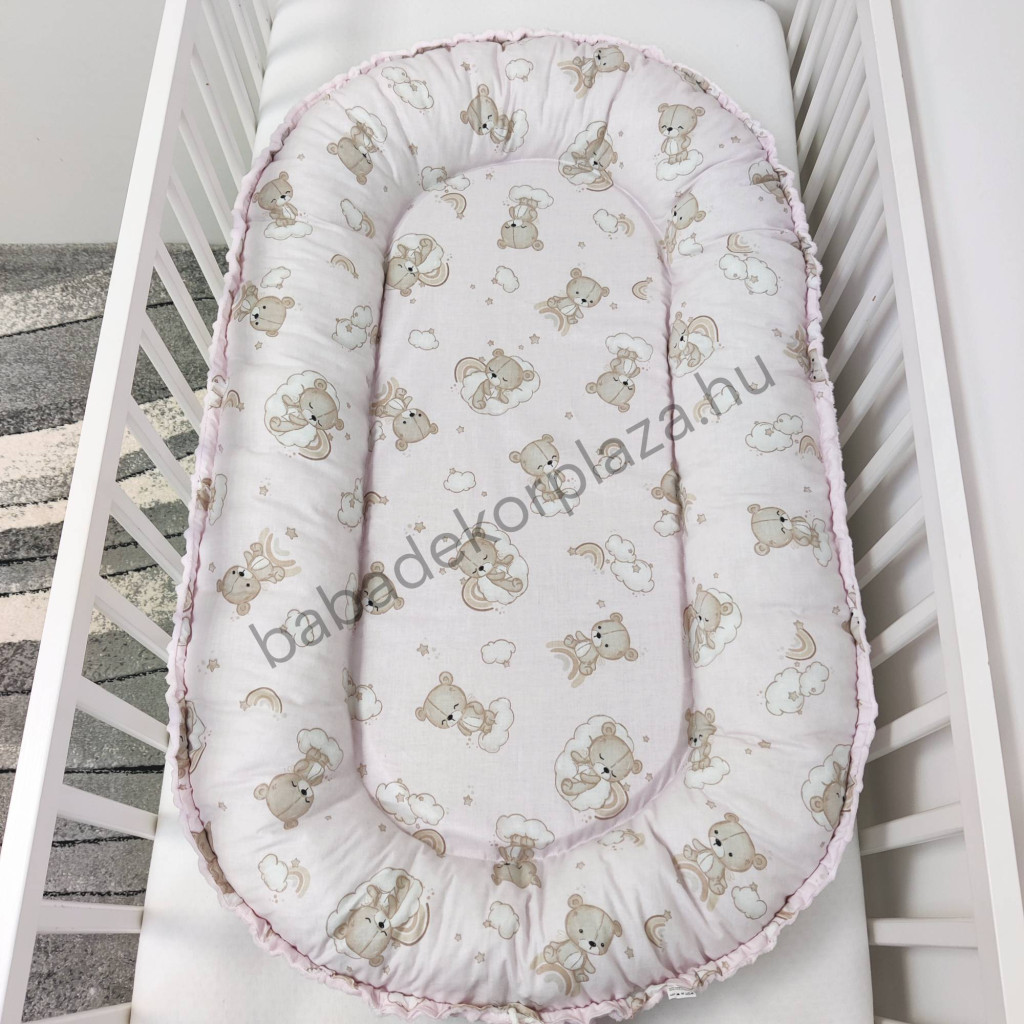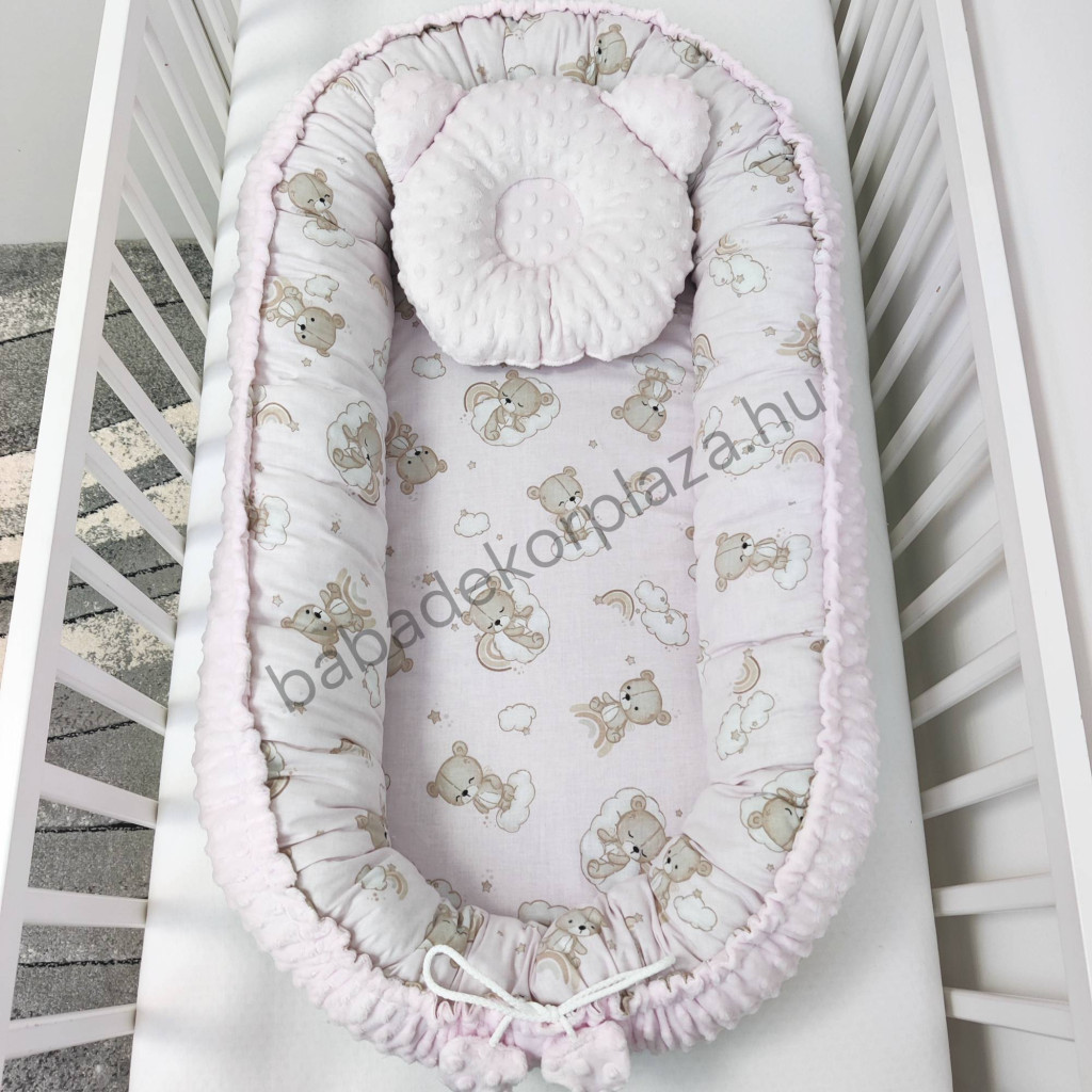 Deluxe Baby babaágynemű garnitúra babafészekkel - 6 részes - Világos rózsaszín - felhőn alvó macikák