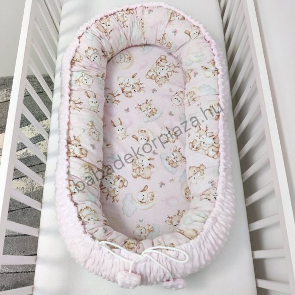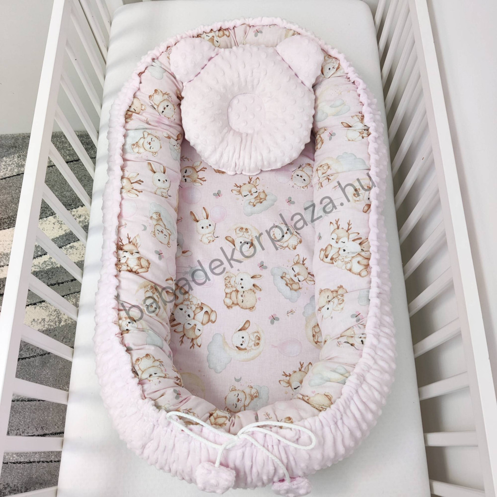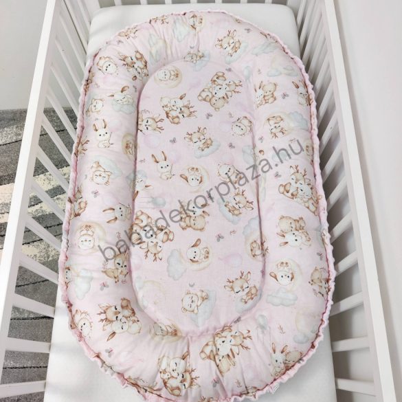 Deluxe Baby babaágynemű garnitúra babafészekkel - 5 részes - világos rózsaszín - rózsaszín bébi erdei állatok