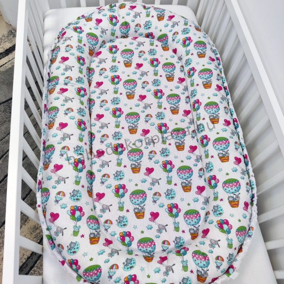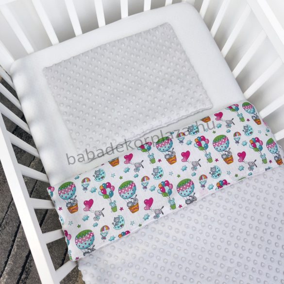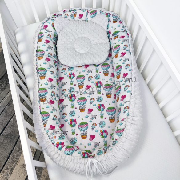 Deluxe Baby babaágynemű garnitúra babafészekkel, fonott rácsvédővel - 5 részes - Minky szürke - cicák és kutyusok hőlégballonban II.