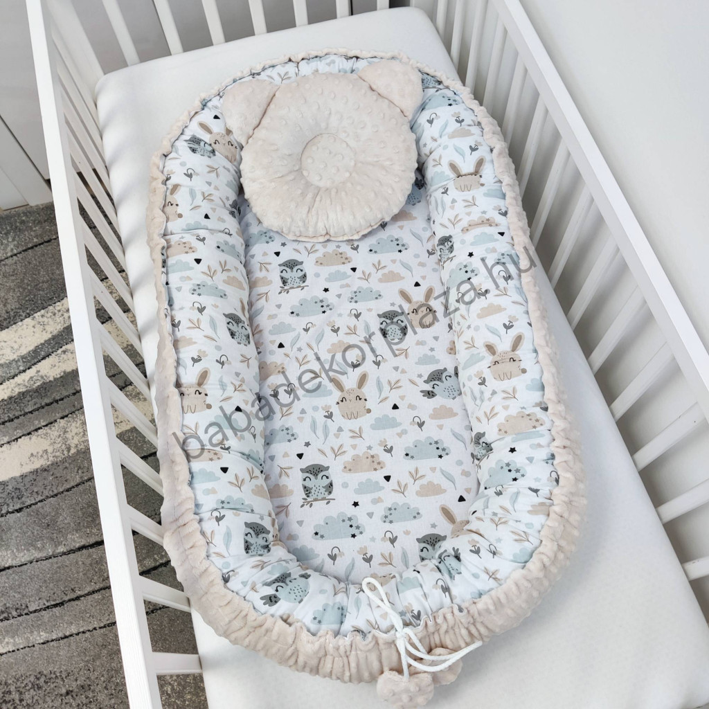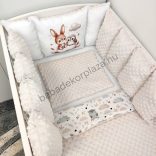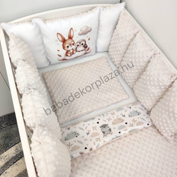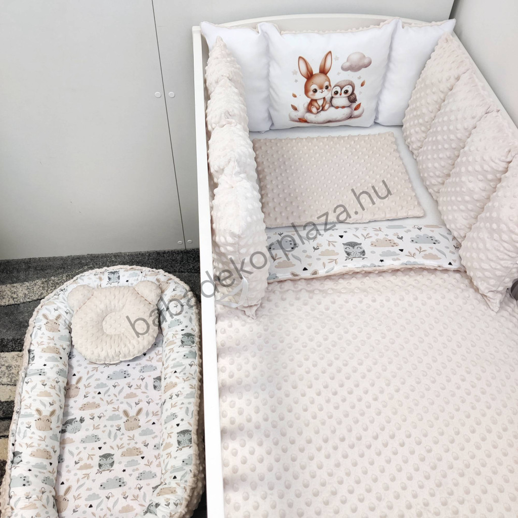 Deluxe Baby babaágynemű garnitúra babafészekkel, Extra párnás rácsvédővel - Dreamland Collection - mogyoró nyuszi és bagoly