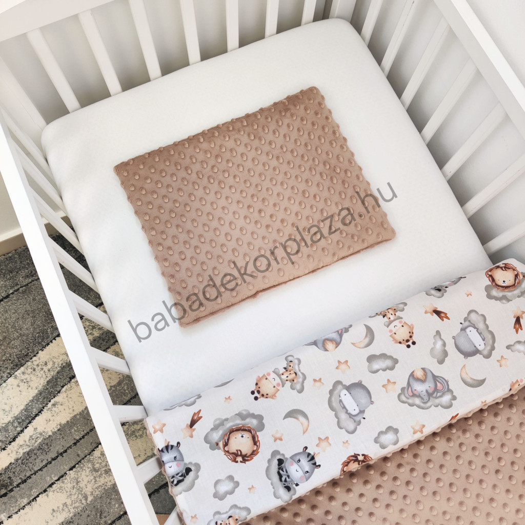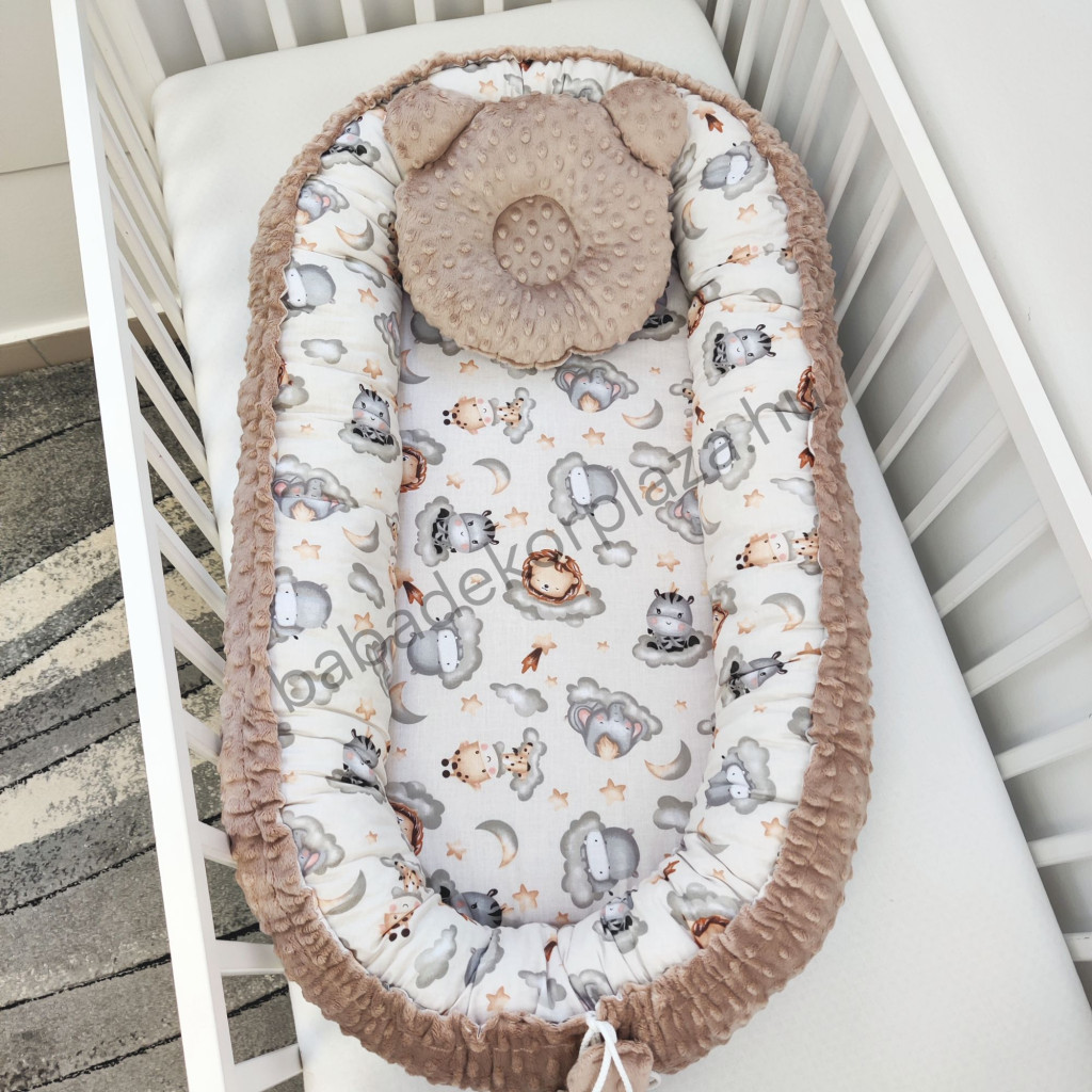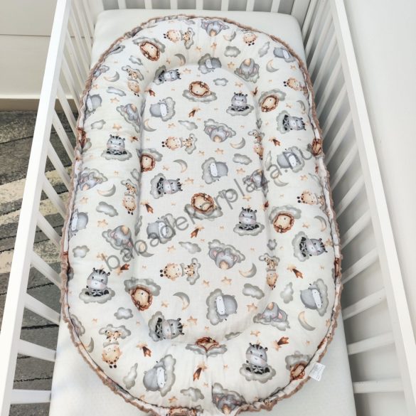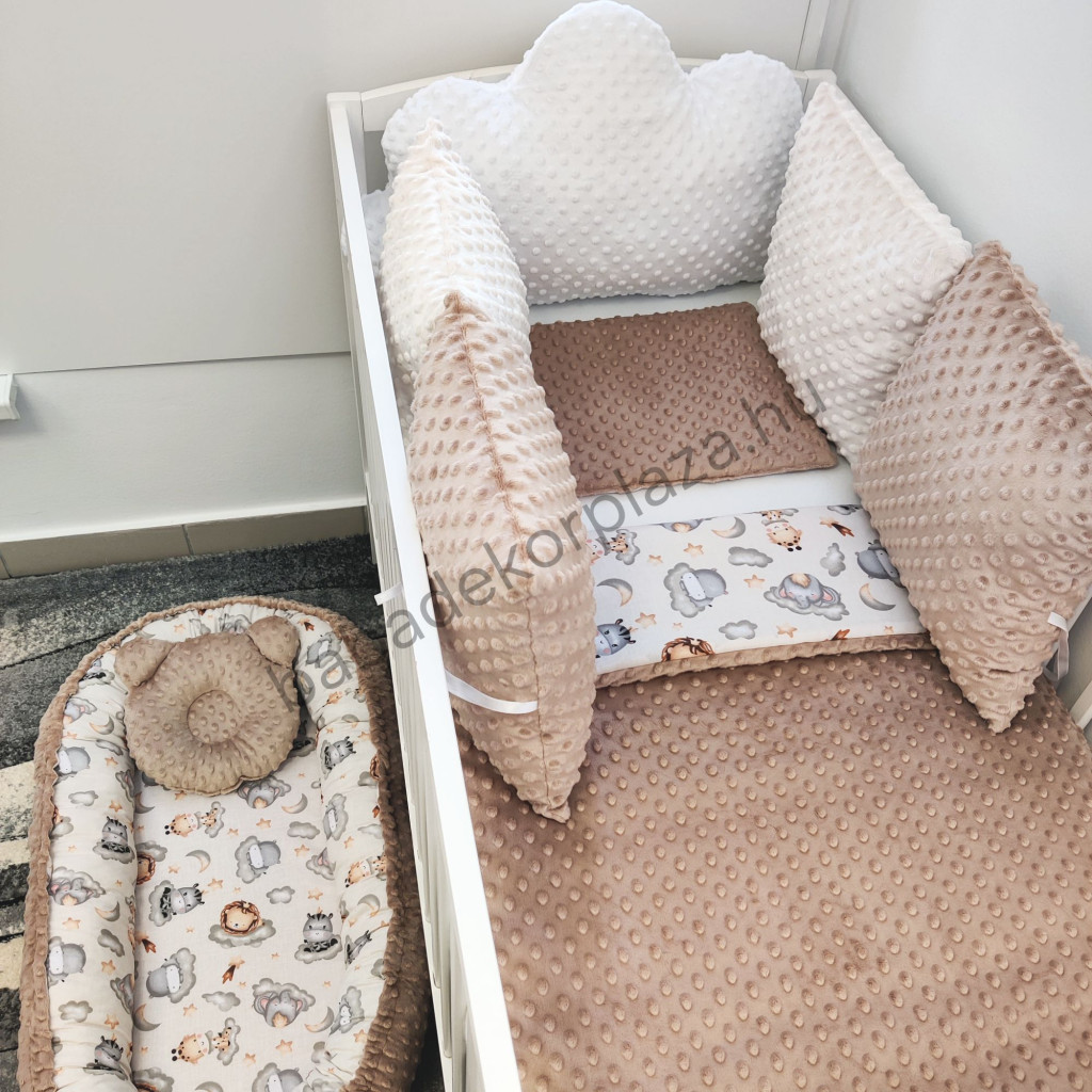 Deluxe Baby babaágynemű garnitúra babafészekkel, felhőpárnás rácsvédővel - fehér - cappuccino - mogyoró - vidám szafari