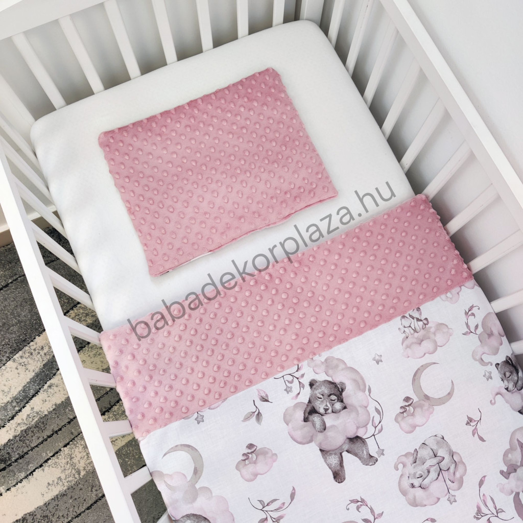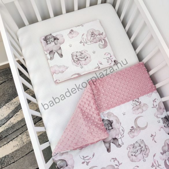 Deluxe Baby 3 részes babaágynemű garnitúra - takaró + párna + fonott rácsvédő -Mályvarózsa - Mackó és barátai a felhők között