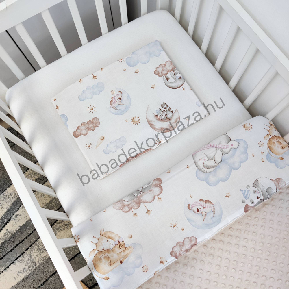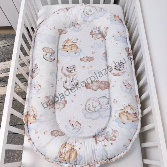 Deluxe Baby babaágynemű garnitúra babafészekkel - 5 részes - mogyoró - felhőn alvó állatok I.