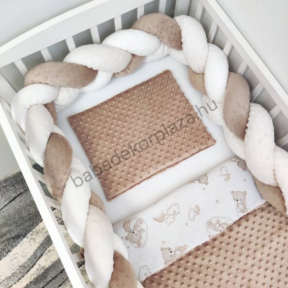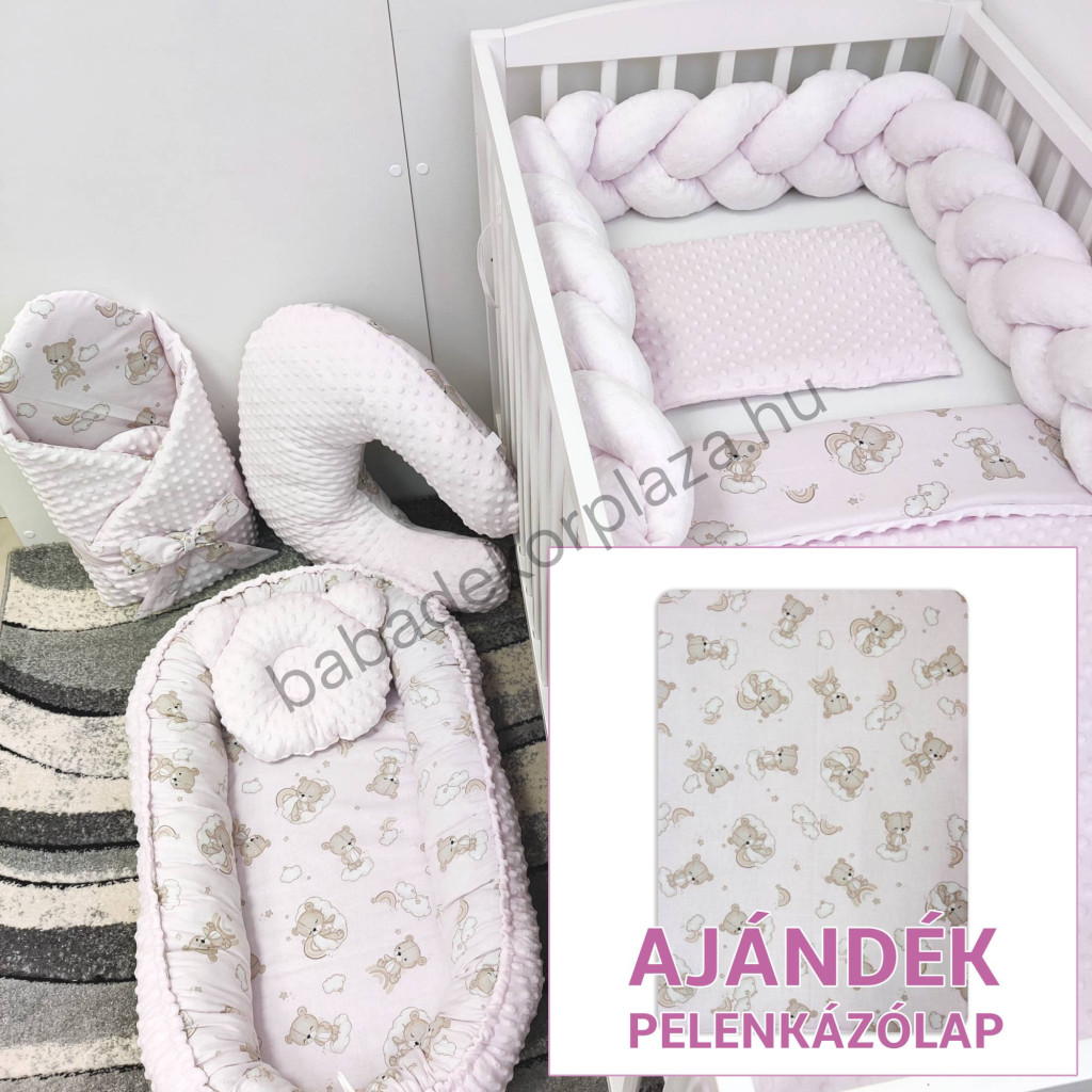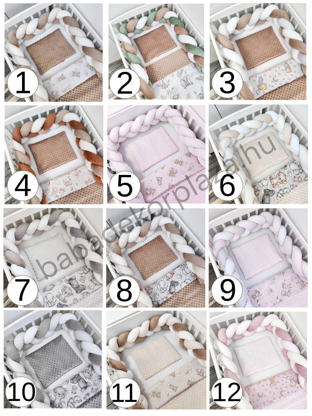 8 részes teljes babaágynemű garnitúra puha, minőségi, bababarát anyagokból. Többféle színösszeállításban rendelhető.