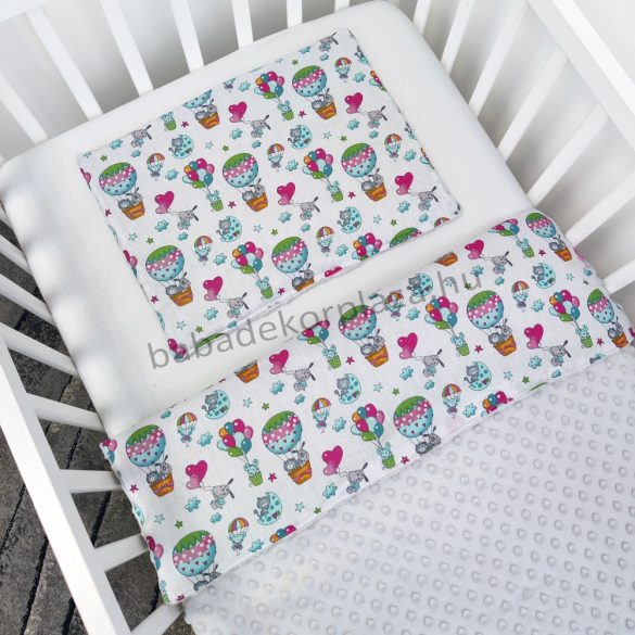 Deluxe Baby 3 részes babaágynemű garnitúra - takaró + párna + fonott rácsvédő - Minky szürke - cicák és kutyusok hőlégballonban II.