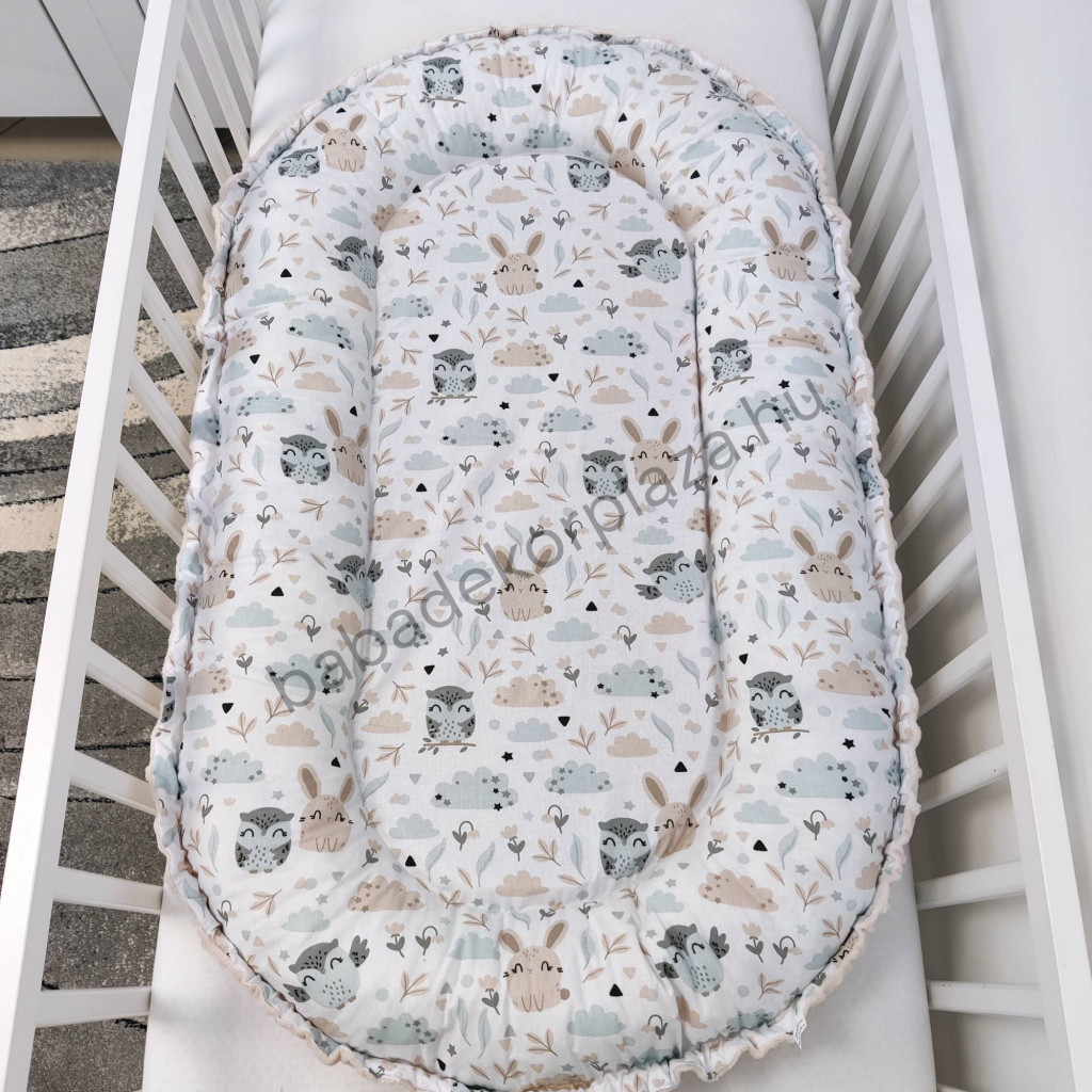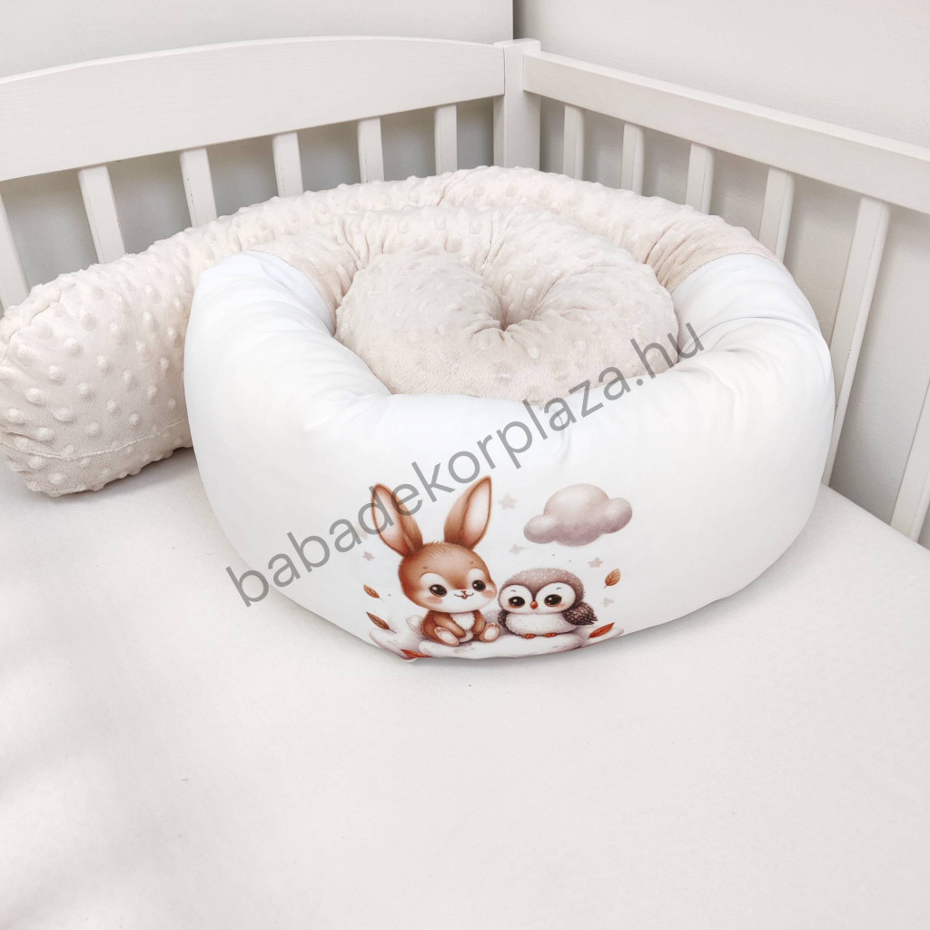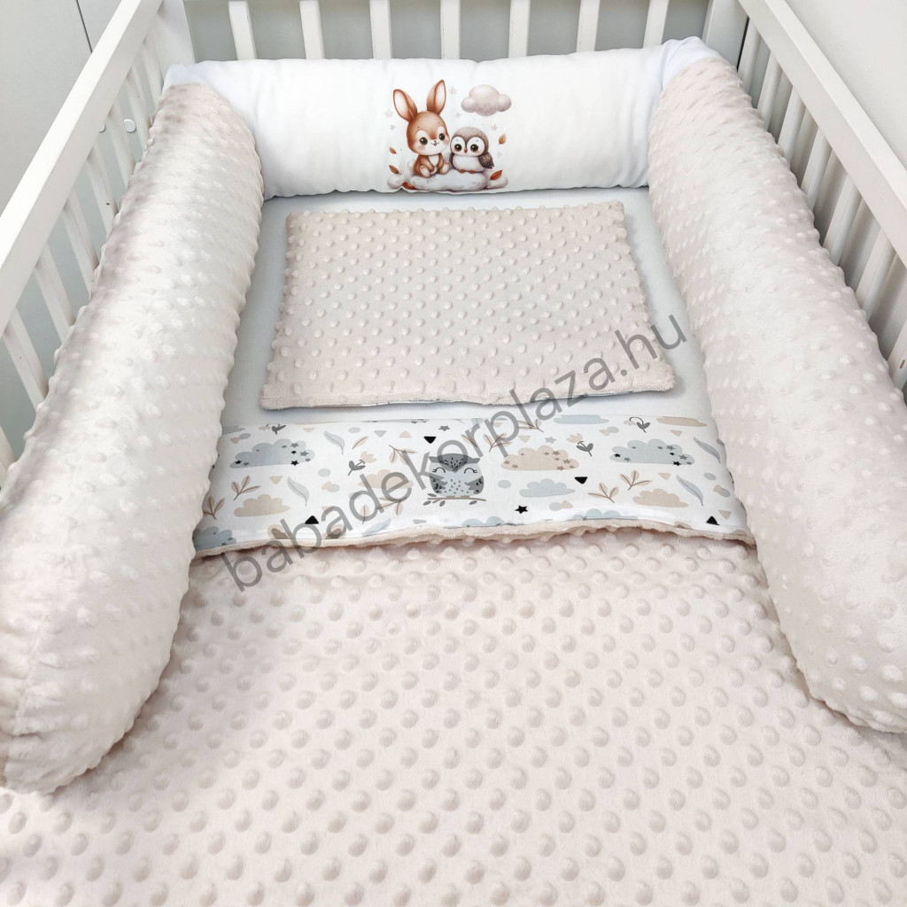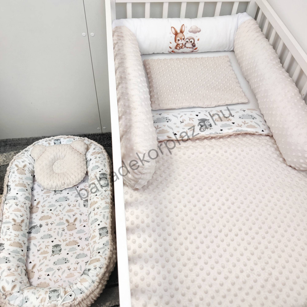 Deluxe Baby babaágynemű garnitúra babafészekkel, hengerpárnás rácsvédővel - mogyoró nyuszi és bagoly