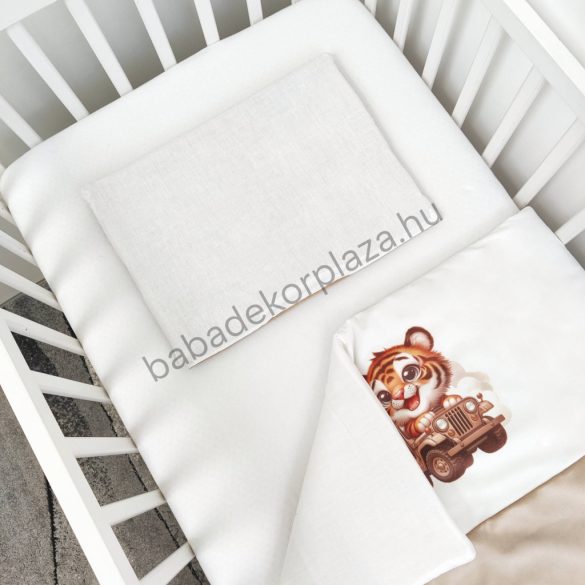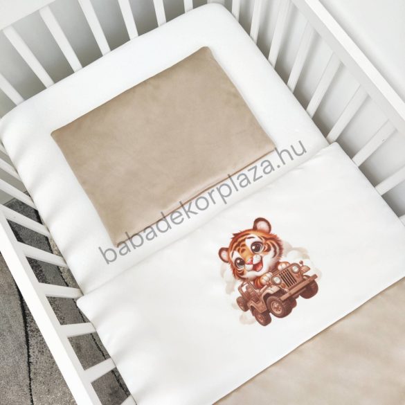 Deluxe Baby 3 részes babaágynemű garnitúra - takaró + párna + fonott rácsvédő - aranyhomok - vidám tigriskölyök