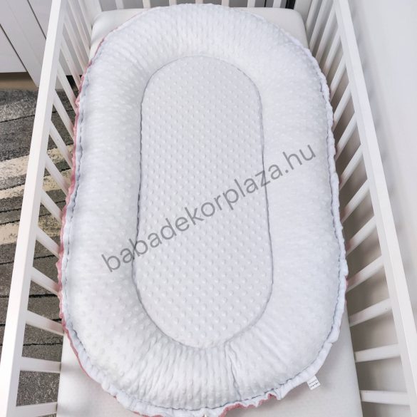 Deluxe Baby többfunkciós babafészek macipárnával, fekvőbetéttel - Minky mályvarózsa-fehér - egérke virággal