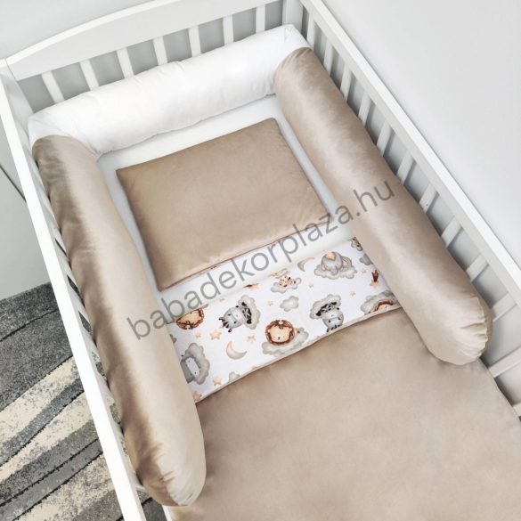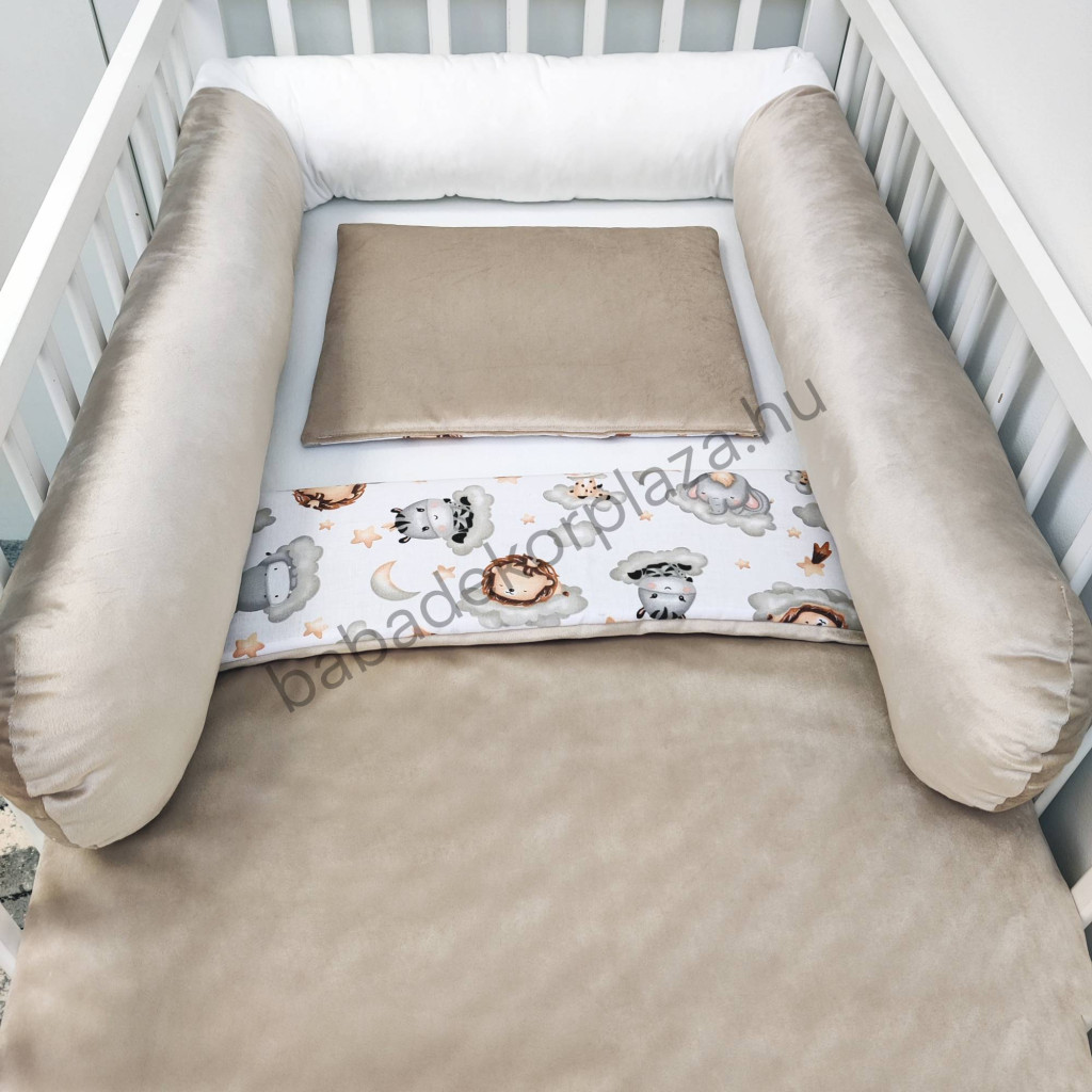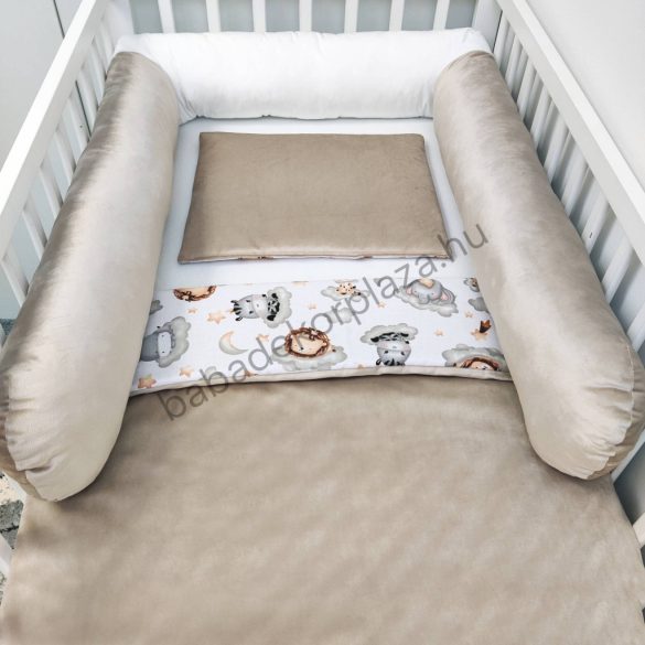 4 részes babaágynemű garnitúra puha, bababarát 100% pamut és pihe-puha bársony anyagból.