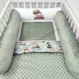 Deluxe Baby babaágynemű garnitúra hengerpárnás rácsvédővel pihe-puha Minky és mintás anyagból, vidám mintákkal.