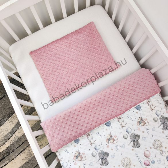 Deluxe Baby 3 részes Minky babaágynemű garnitúra - takaró + párna + fonott rácsvédő - mályvarózsa - elefántok léggömbökkel
